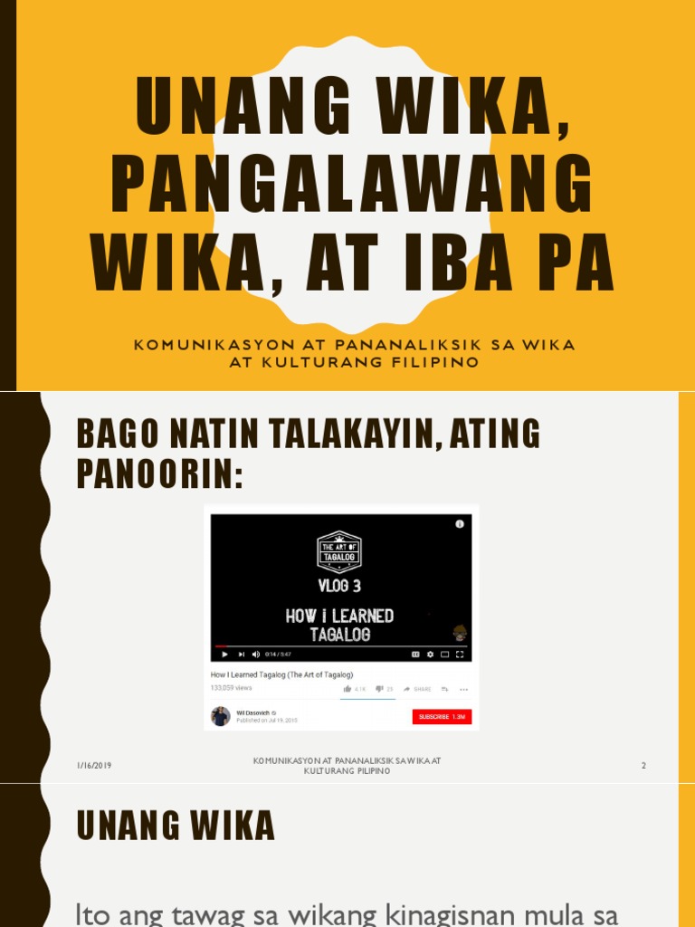 Unang wika pangal awang wika at iba pa k o m u n i k a s y o n at pa n a n a l i k s i k s a w i k a at k u lt u r a n g f i l i p i n o bago natin talakayin ating panoorin. Bukod rito ang pangkalahatang wika na ginamit sa mga paaralan ang Filipino at Ingles. Wika Bago Dumating ang mga Mananakop sa Pilipinas Ipinasa nina.