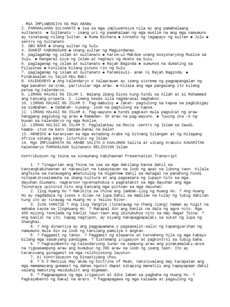 Dahil dito ating namana ang kanilang kultura at mga tradisyon. 2014 2015 Ikatlong Markahan 8-GARNET. 2020-11-15 Isa sa pinakamahalagang ambag ng mga Arabe sa Pilipinas ay ang _____.