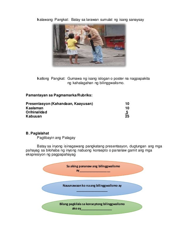 Kahulugan ng bilinggwalismo at bakit nagkaroon nito sa Pilipinas. Pangkatang Gawain Hahatiin sa tatalong pangkat ang mag-aaral. Labinlimang minuto Unang pangkat.