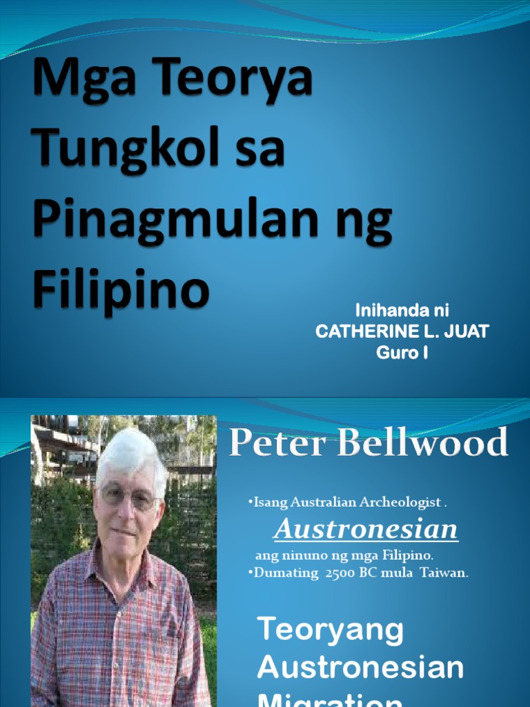 Teorya ng pinagmulan ng unang pilipino 1. Bago ko talakayin ang pagkakaiba-iba ng mga teorya ng pinagmulan ng mga Pilipino akin munang ipapakita ang mga taong gumawa ng mga teorya tungkol dito sa unang paragraph at sa mga sumunod na pargraph ay ang mga tungkol sa teorya ng mga ito. 7222014 Teorya ng Pinagmulan ng Unang Pilipino 1.